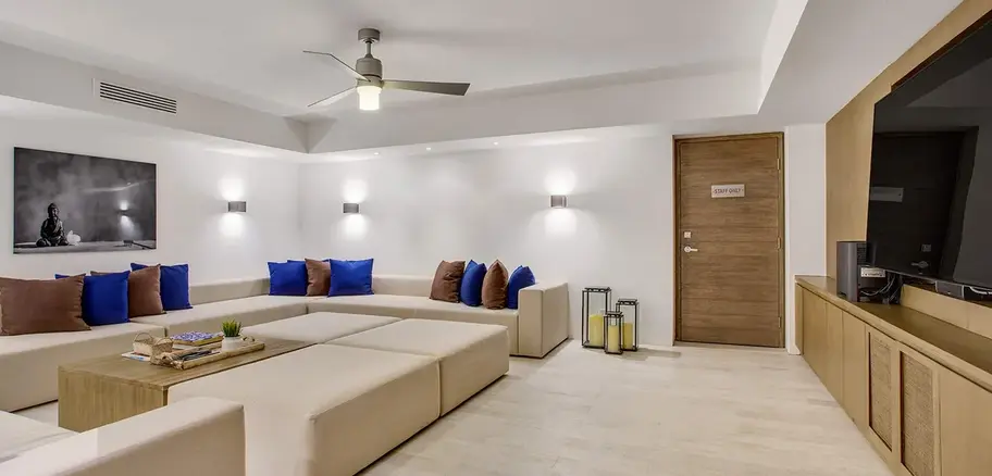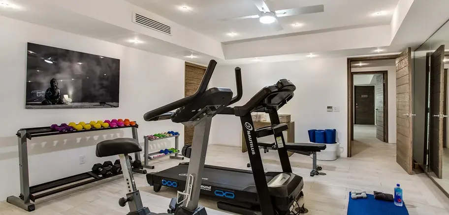 The interior spaces cannot be overlooked. They offer spacious living areas that open out onto the pool terrace, creating a perfect synergy between the indoor and outdoor spaces. As if this were not enough, the villa features a fully equipped fitness room, ideal for those who wish to stay active during their stay, as well as a media room perfect for enjoying a movie or a moment of entertainment in a more private setting.