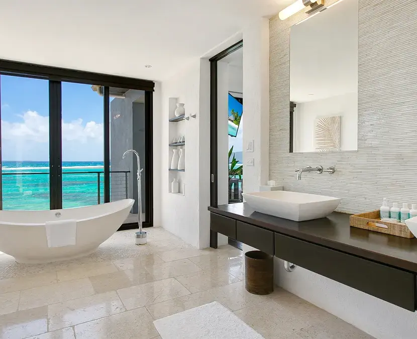 Master Bedroom 2, also on the main level, has a king-size bed. The en-suite bathroom features a freestanding tub, indoor and outdoor showers, and a double vanity. Air conditioning, a ceiling fan, and a television are included. The bedroom opens onto a furnished balcony with captivating views of the Caribbean Sea and Sint Maarten.